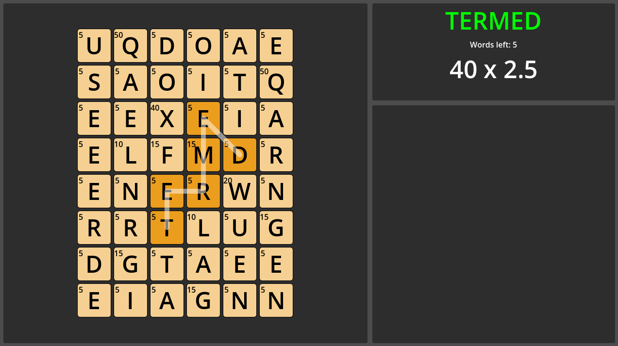 This is a game idea I've had for a while that I originally prototyped with Scrabble tiles. I wrote all the code myself but had a bit of assistance from some professional coders who helped me find the best way to attack the project. Future plans for this project include adding a settings and options menu that allow you to change various aspects of gameplay along with multiple preset game modes.